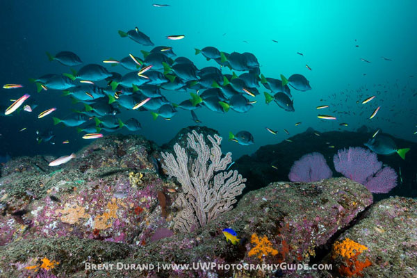 The Corridor is a section of coastline between Cabo San Lucas and Cabo Pulmo. It’s here that massive rock structure with swim thrus and channels meets deeper pinnacles blanketed in small gorgonians. Schools of fish pass by and you need to keep your eyes in the blue for a chance at seeing mobulas, whales, whitetips or any number of other fish/mammals.