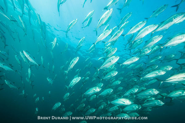 A school of jacks blasts by us near Chileno Bay, during a Corridor dive.