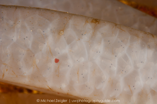 Close-up of squid egg case at Indian Head Rock, Catalina Island by Michael Zeigler. "You can make out the eyes of the tiny, developing squid, and some are starting to show signs of purplish pigment spots." Nikon D90 in an Ikelite housing, 60mm + 1.4 teleconverter, 1/125th, F22, ISO 200.