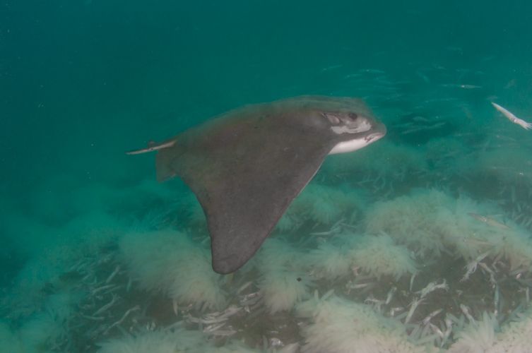 A bat ray cruises over the masses of squid eggs and dead squid at Catalina's west end. Nikon D300, Tokina 10-17mm FE lens, and two YS250 pro strobes. Photo by Mike Bartick