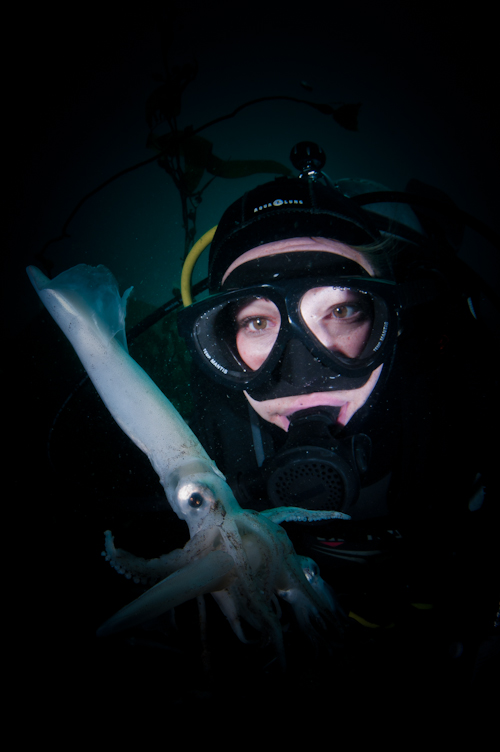 Mike's model, Terry, and a pair of mating squid. Nikon D300, Tokina 10-17mm FE lens, and two YS250 pro strobes. Photo by Mike Bartick