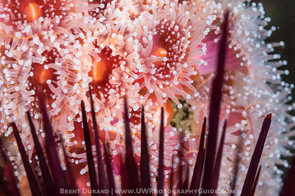Corynactis with urchin spines in the foreground. Shot with Canon 7D Mark II and Canon 100mm macro lens.