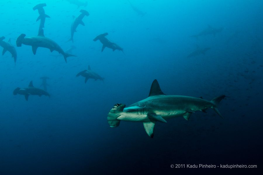 Hammerhead sharks photographed at Cocos Island. Photo by Kadu Pinheiro