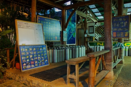The dive area is well organized with assigned cubbies and lots of rinse tanks. A large rubberized rinse tank is set up for photo equipment.