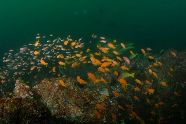 We knew that mantas and whale sharks would be our main attraction, but what we weren’t prepared for were the total “unusual” conditions we found. The water, which is normally about 26c (78.8F) this time of year varied from 20c (68F) to a bone-chilling 16 (60.8F). Since I am normally cold in a 7mm in 85 degree water, you can imagine my shock in a rented 5mm in 60! Not only that, but because of the upwelling associated with the unusual wind direction the normally clear water was very green and fairly dark with  a range of 20’ to 30’ visibility. I didn’t even to rig my video the whole week.