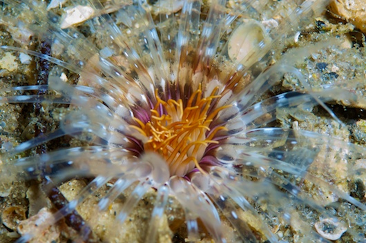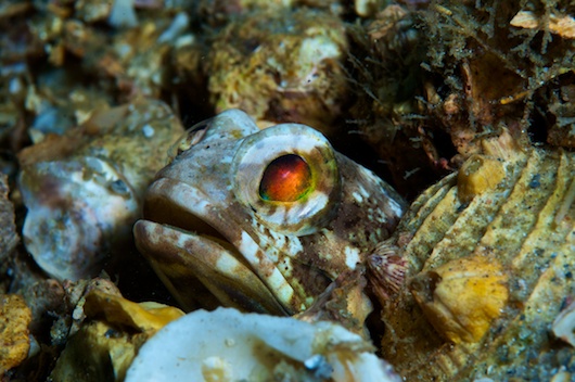 A focus light is very helpful, along with attention to strobe placement (to avoid backscatter). With my DSLR camera, I used a 60mm macro lens along with a 1.4 teleconverter. I like to keep my Inon Z240 strobes (2) positioned behind the front plane of the housing port. Usually they are pointed outward in the 10 and 2 o’clock positions.  The 10-2 positions are helpful when shooting near a reflective bottom, like sand.  I also like to place the strobes like “street lamps” above the port but again pulled back so that they don’t overhang the front of the glass. Finally I often turn one flash off and position just one strobe. With such a long dive you can work the subject and try multiple techniques. The object, obviously, is to get very close. To this end I will take an exposure shot and adjust strobe output, f-stop, and shutter speed accordingly. Then stalk the critter. I try to avoid checking the histogram/ LCD as much as possible to minimize motion so that each successive shot can be a little closer.
