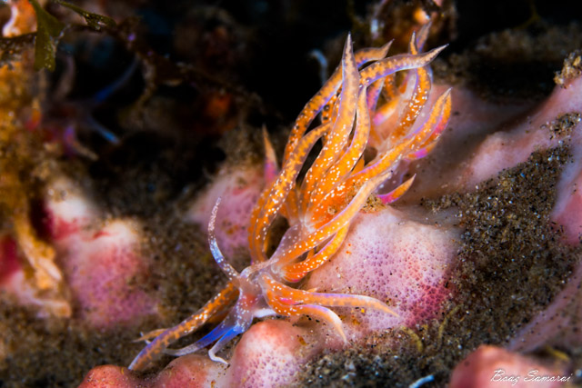 When photographing a Nudibranch, make sure that the focus point is set either on its front two rhinophores or on the exposed gills on its back. If photographing the Nudibranch from its front, try positioning your lens within a straight 90-degree angle so the front of the Nudibranch is focused and the rest of its body gradually blurs out. Another option is shooting them from the side, thus having more details of their body in focus. Whatever you do, avoid shooting them from the top. Take into consideration that some of the nudibranch species here are extremely small, such as the sheep nudibranch. The first time I was shooting one, I had no clue what I was looking at and only figured it out when reviewing the image on the camera screen and zooming in. I was more prepared for the next shot, that’s for sure…