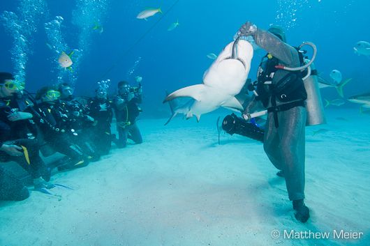Shark professional Cristina Zenato hand feeding Caribbean Reef Sharks.