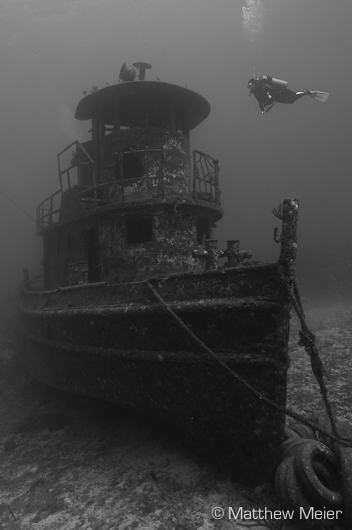 Scuba diver hovers over the bow of this 50-foot, triple-decker tugboat called La Rose Wreck.