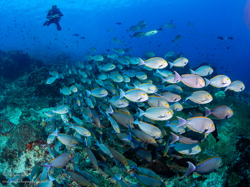 Then we found a very friendly, very large school of surgeonfish, and played around with shaping the school and trying out different dive modeling angles.