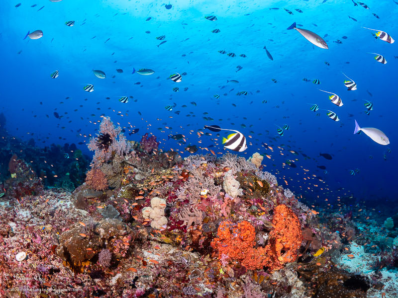 The current was gentle but insistent; fortunately, the topography provided a lot of shelters where we could drop in behind rocks and get out of the current altogether. Philippe took me right to an amazingly beautiful orange-encrusted rock covered in anthias, and I took my time making sure I at least tried to capture the beauty.