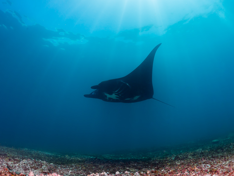 Manta in the Cauldron. Olympus OM-D E-M1, Nauticam housing, Oly 8mm fisheye lens, 2x Sea & Sea YS-D1 strobes. f/6.3, 1/125 sec, ISO 200.
