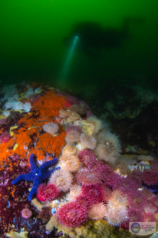As the current began to slow, we kicked between different overlapping slabs of rock at the top of the wall. Short metridium anemones turned into painted anemones and then sea stars and encrusting sponges over the areas hardest hit by current.