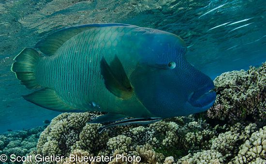 Napolean wrasse surveys the reef with a shark in the distance in Fakarva.