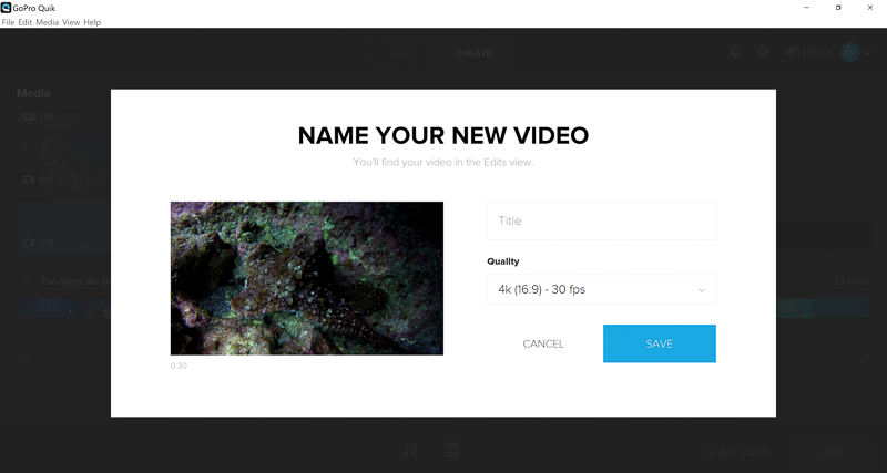 You’ll now find your videos under Media on Quik’s View screen. You can double click to watch your video full screen. In full screen mode you can scrub through with the play back slider and mark your hilights as you see them by pressing H on your keyboard. An orange marker will appear. Hover over it again and an X will appear over the orange dot if you choose to delete it.