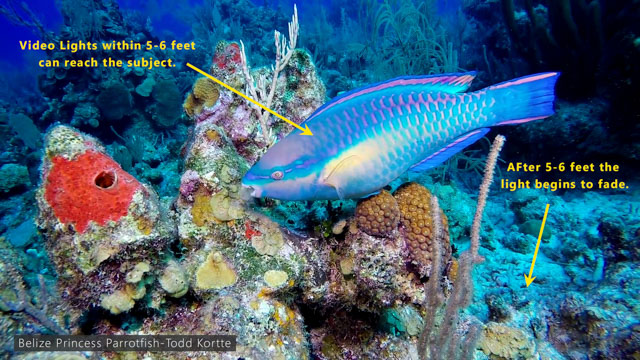 Underwater lights are good up to about 5 or 6 feet away, depending on the number of Lumens of the light and the visibility of the water. The higher the Lumens on the light, the better. After 5 or 6 feet, the light is absorbed by the water and is overpowered by the blue ambient light that exists underwater. Subjects closer to your lights will have better results than those further away. The direction you point your lights will result in different outcomes (e.g., more or less shadow, softer or harder light, etc.). Experiment around with different angles, adjustments, and power settings until you create your own look and style.