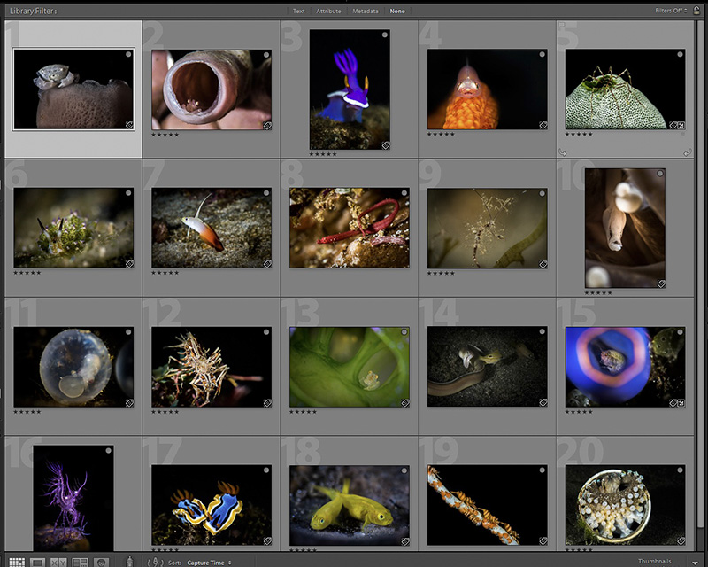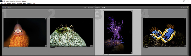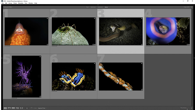 Now it is time to eliminate further. Sometimes this part of the process is difficult because you have emotional attachments to some of the images even though they might not be winning material. For example, the hunting eel image was very exciting to me because I captured the thrill of the hunt. However, the image has several issues. It is too dark, part of the eel’s body is cut off, and it isn’t tack sharp. So I will eliminate that one. The same is true of the amphipod inside a tunicate. This was a difficult shot and although that carries some weight, a judge might eliminate the image because part of the tunicate is cut off, or that little piece of algae in the top right is distracting. You see, you want to choose images that are as technically perfect as possible so that a judge has no reason to eliminate it. I would also eliminate the wire coral shrimp because the wire coral does not go perfectly from corner to corner. That leaves us with these four images:
