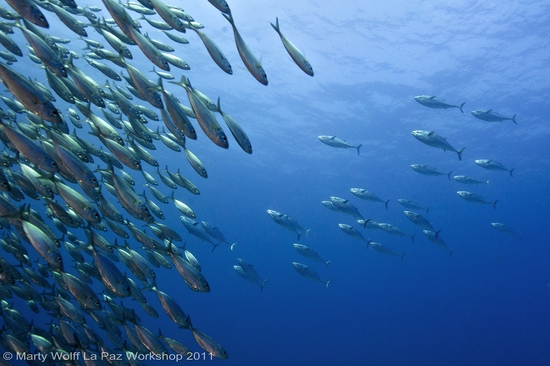 Tuna hunting the baitball. The tuna are much larger, but they are in the background.  1st Place – photo by Marty Wolff.