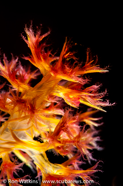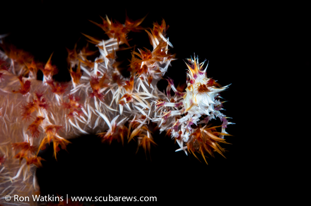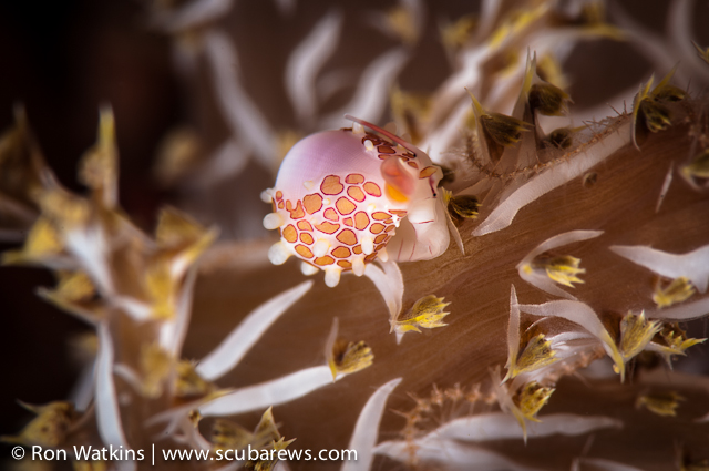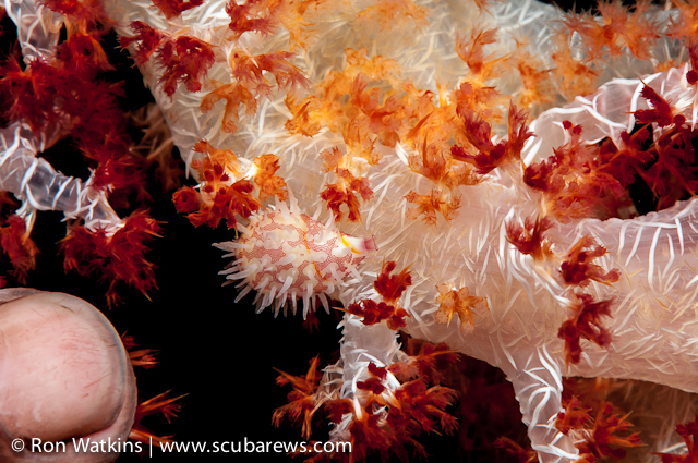 The third dive of the voyage was at South Emma, where I decided that it was time to get my diopter wet. I started off with some nice easy macro subjects of nudibranchs and coral, then my keen-eyed dive master Digger motioned that he had found something small for me. It was a tiny cowrie on a large red soft coral at about 80 feet deep on the side of the pinnacle. I flipped on the diopter, carefully positioned myself and looked through the viewfinder. All I could see was fuzzy red and orange anemone and no sign of the cowrie. I looked all over the place, peeked out over the camera for reference and then tried again to no avail. The narrow quarter-inch DOF makes it difficult to locate a subject. Digger, sensing my frustration, stuck his finger right next to the cowrie. I was able to find his finger, follow it down to the nail and there it was. I tightly pressed my mask against the viewfinder to see and focused in on the tip of his finger with autofocus. Then I switched to manual focus, slowly moved in and out about an inch and when the cowrie looked crisp, I gently pressed off a few shots.