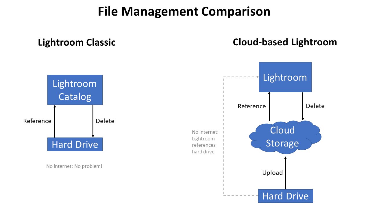 The two versions of Lightroom have very different philosophies for handling files, catalogs, and so on. Lightroom Classic handles everything through the hard drive. You import files from your hard drive, and manage them on the hard drive.