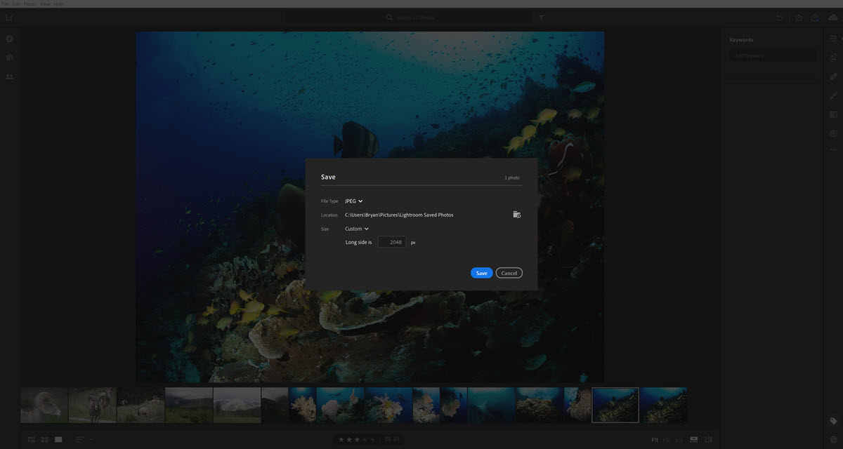The other place where cloud-based Lightroom really falls down is exporting files. If you want to print your photos, it is best to export as full-sized TIFF files, which can only be done by Lightroom Classic, or Photoshop (adding extra steps). Even just for social media sharing, it is useful to be able to downsize image resolution and quality for faster uploading, and to add a watermark (this is done much more commonly for underwater photography than land photography). Again, you could use Photoshop, but that takes up a whole lot more time.