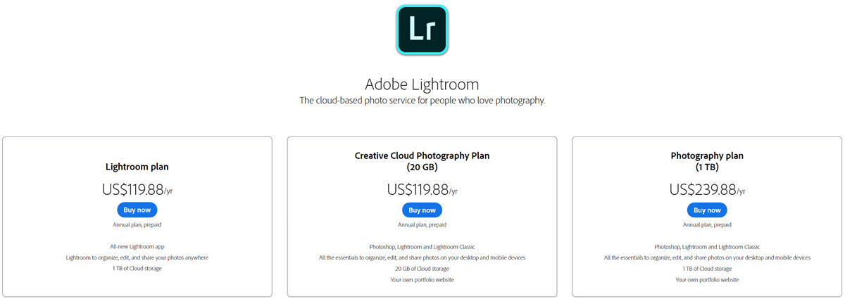 • Photography Plan: $240/yr for Lightroom (with 1 TB cloud storage), Photoshop, and Lightroom Classic