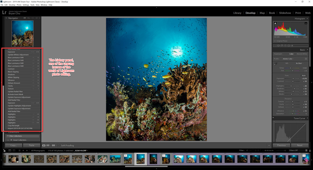 The main editing functions between the two programs are basically the same, though cloud-based Lightroom does have a simpler, more intuitive interface. Unfortunately, cloud-based Lightroom is missing one very, very important function that Lightroom Classic has; the history panel. The history panel in Lightroom Classic allows you to step through every edit you have made to a photo. This is especially useful when editing underwater photos, as there are so many changes to be made that it is very useful to go back and compare before/after.