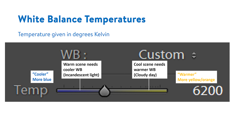 The White Balance setting is defined by the Temperature, measured in degrees Kelvin. Below is a graphic explaining the white balance scale.