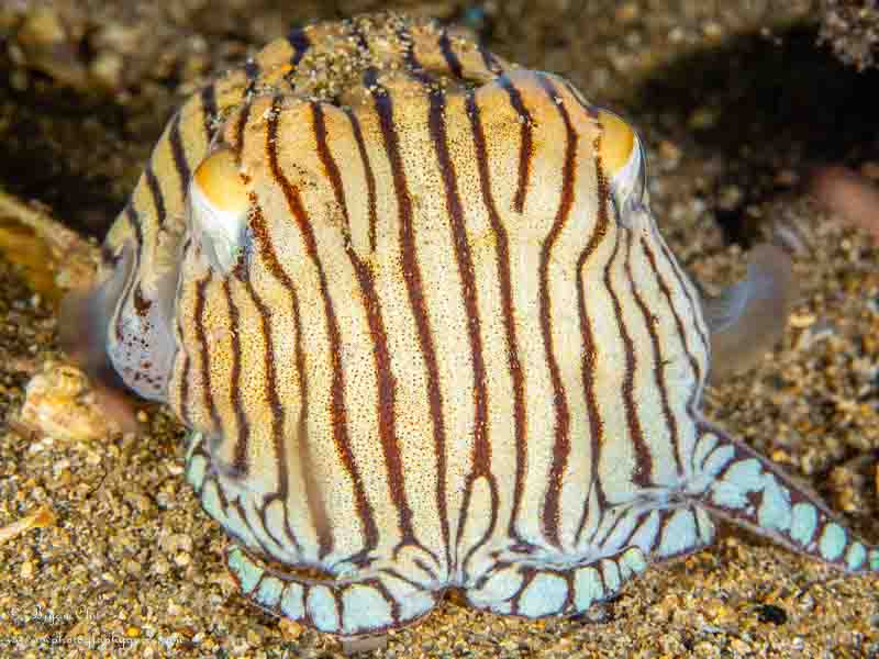 Doing a custom white balance, I could either use the white of the squid’s tentacle or eye, or the grey of the sand. The squid still gave me too warm of a cast to the shot, so I tried it on a few different pieces of sand. I found a piece of sand which I liked, which adjusted my Temperature down to 3800 and my Tint up to 22. It looks a lot better.