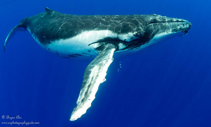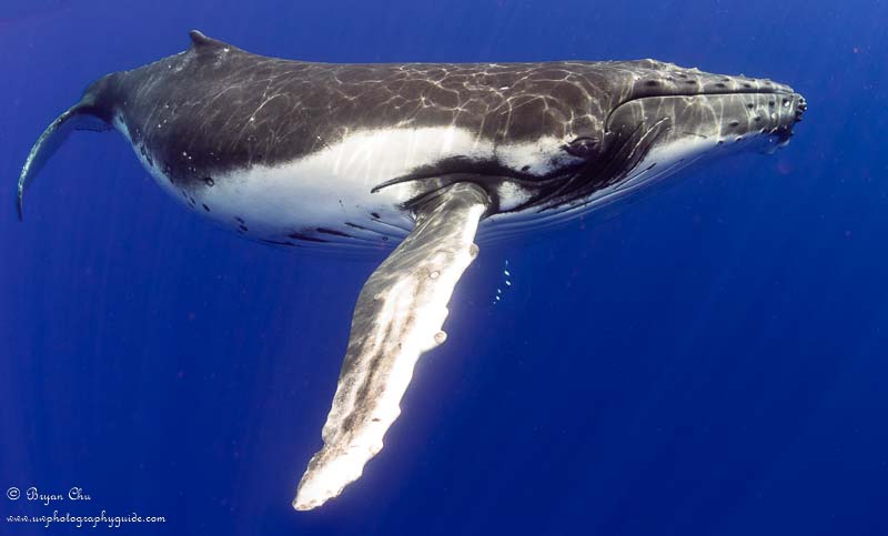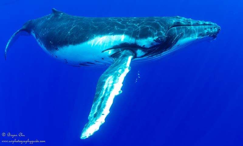 This photo of a humpback was taken in ambient light, a few feet from the lens. The as-shot white balance of 5650 Temp and 7 Tint gave a blue cast to the whale, so it didn’t pop as much as I wanted. So I did an auto white balance on the whale’s white belly, to see what lightroom could do about it. Lightroom basically went crazy, giving me the maximum temperature of 50000 and a tint of 122, as it was trying to compensate for all of the red light lost in the blue water.