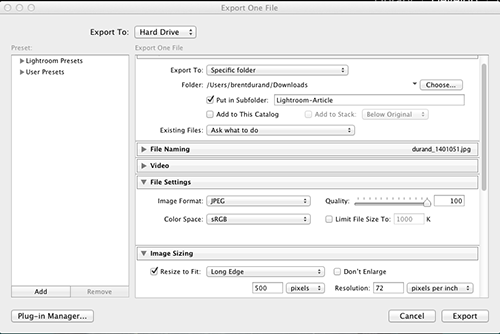 Make sure to set your photo dimensions for the size you will want to share. I usually export them at 2000 pixels wide for slideshows, or 1024 for facebook uploads or web sharing.
