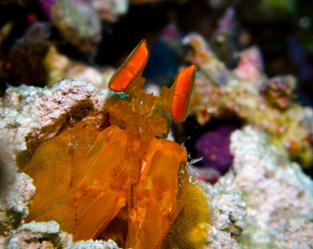 Golden mantis shrimp. Taken with single Inon D2000 at ISO80. Shot with manual mode at f8 and 1/250s.