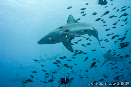 Try using your strobes on low power if the sharks are coming close enough for them to make a difference so you add a little light and color without blowing out their white underbellies. I found that because of the distance, often it was better to just shoot with ambient light.