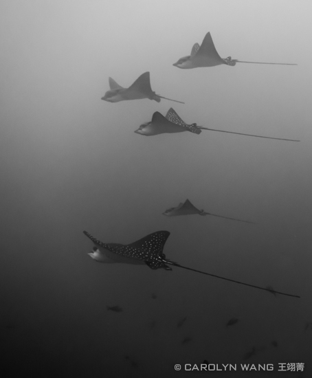 Eagle Rays. Sony RX-100, Recsea Housing, UWL-04 lens, ambient light, 1/100 sec, f3.5, ISO400. Most of us are happy to see just one eagle ray on a dive. At Malpelo, these eagle rays traveled in a group of 5-8 over the course of our week of diving, and we saw them on every visit to the dive site.