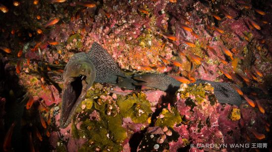 Pacific Creolefish and Moray Eel. Sony RX-100, UWL-04 wet lens, Recsea Housing, 2x Sea & Sea YS-D1 strobes, 1/125 sec, f6.3, ISO200. Schools of creolefish swarmed over this colorful reef as a moray eel looks on.