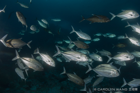Bigeye Trevally. Sony RX-100, UWL-04 wet lens, Recsea Housing, 2x Sea & Sea YS-D1 strobes, 1/80 sec, f6.3, ISO400. This school of jacks swirled around us for a several minutes and during our safety stop before moving on. Mating pairs often travel closely together and the males darken to almost black as seen here.