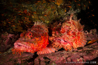 Pacific Scorpionfish. Sony RX-100, UWL-04 wet lens, Recsea Housing, 2x Sea & Sea YS-D1 strobes, 1/800 sec, f5.6, ISO100. The scorpionfish on the left was resting until the fish on the right decided to cozy up next to it. It was quite common to see more than one animal at a time at Malpelo.