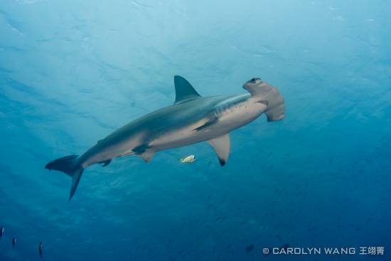 Scalloped Hammerhead Sharks. Sony RX-100, Recsea Housing, UWL-04 lens, ambient light, 1/100 sec, f3.5 ISO400. Schools of hammerheads would circle around the cleaning station for many passes in the blue while a few would venture closer.