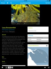 You can add your own notes to each species and create your own personal list of favourite marine animals, or animals seen on a dive, with the “My Reef” facility, and make personal notes/logs. Save, display and edit your list whenever you like. Distribution maps are provided with the opportunity to add to our knowledge by reporting your discoveries. A Rogue’s Gallery provides images and references for unusual marine creatures that might otherwise be difficult to find.