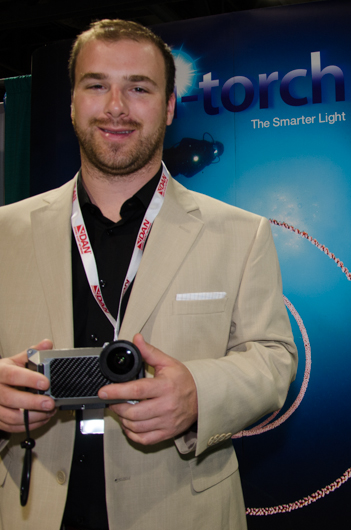 Doug Taleski, president of i-torch, proudly shows off the new iPix A5 housing for the iPhone 5. There is a custom app available at the App Store, along with buttons on the enclosure to optimize still and video camera functions up to 183 feet! It also includes an integrated universal tripod mount which works great when attaching it to a tray and light set-up. Lens bezel allows for the attachment of external filters and lenses (pictured). http://www.itorch.ca