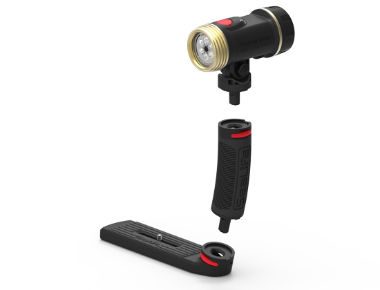 The light can be hand held with its Flex-Connect grip or mounted to one or more extendable flexible arms and trays that attach to the tripod mount of any SeaLife or other camera. A Dual Tray holds two lights, and a third light can be mounted on top of the camera’s cold-shoe creating a video or photo system with up to 6000 Lumens.