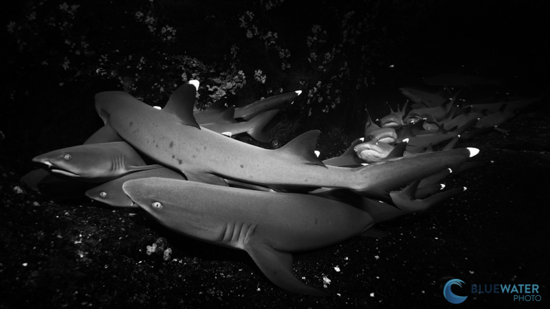 Whitetip reefsharks pile up at Roca Partida, Mexico. Photographed with a Nikon Z7II camera in an Ikelite Z7II housing with the Nikon 8-15mm fisheye lens. 1/60, ISO 400, f/14