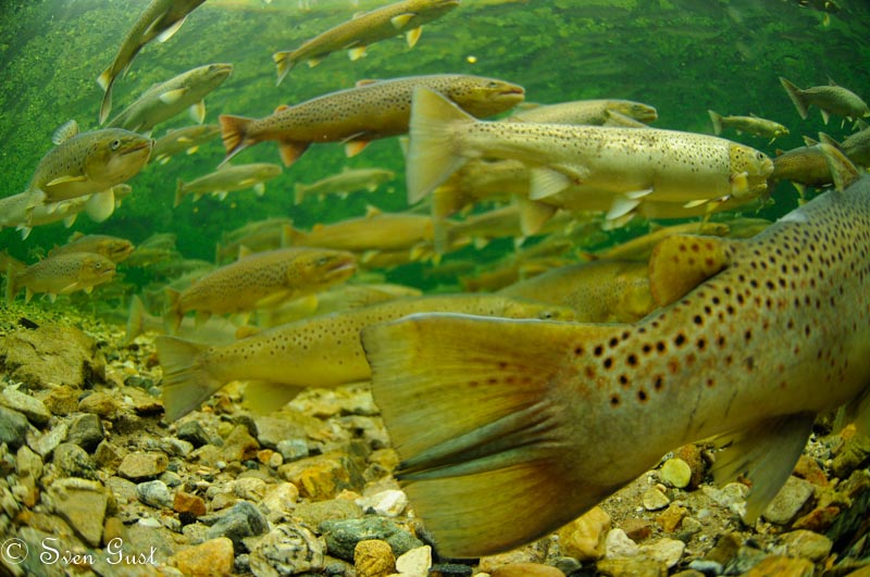 Atlantic Salmon and sea trout in a river in Norway. They were shy, so I put my Nikon in a pool and put the camera in auto mode, taking a picture every 15 seconds. In the end they were as close as I could wish.