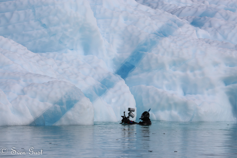 Last winter in Greenland we dove on an iceberg in the Tasiilaq harbor. The iceberg was frozen in the sea ice and covered with snow, so we did not realize at first that it was blue ice, which has the most interesting structures. Since I did the surface support I did not have much time for diving myself. It’s always amazing diving under ice and next to an iceberg. This one was more than 30 meters deep, which you would never believe when you just see it above surface.