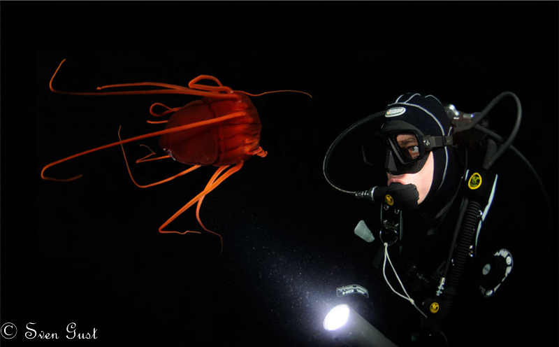 Diver with a deep sea jelly (Periphylla periphylla) in the Trondheimfjord.