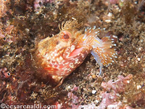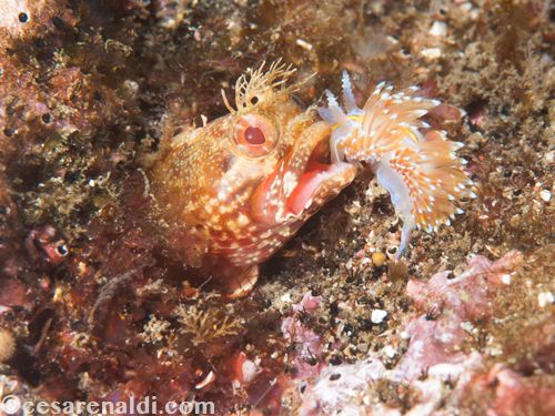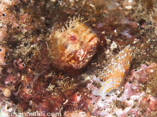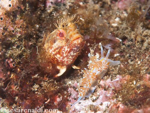 I had to wait several minutes before the nudibranch passed in front of the Fringehead, and when the position was right I started shooting, hoping for the nudibranch to get closer and closer. And at the end, it got so close that it stopped and stood up right in front of the jaws of the Fringehead. It stayed like this for ten long seconds until the fish decided to get a little taste of this boldfaced sea slug.
