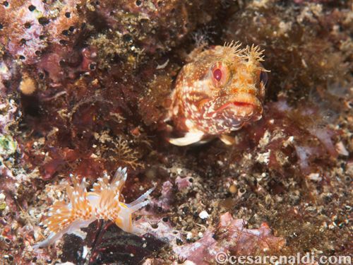 I spotted the Fringehead after a long dive, and since I hadn’t seen one recently I decided to take a snap shot just to keep a memory of the encounter. The fish was positioned on a flat rock and there was no possibility of finding a nicer composition or any interesting lighting effect. But as I got ready for the shot I noticed that there were many nudibranchs, including a Hermissenda crassicornis very close to the Fringehead. Naturally, the thought of making a more interesting photograph with the nudibranch and the fish in the same frame came to my mind.