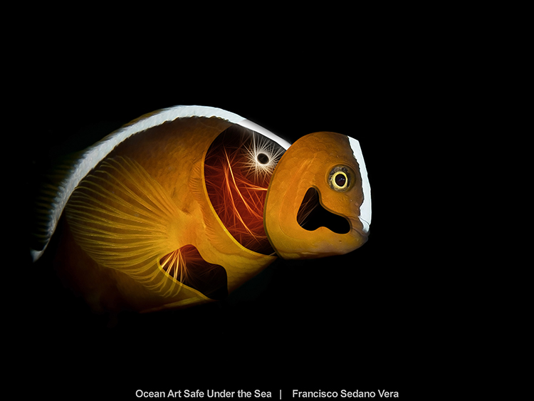 Technichal details: The original image of the clownfish  (Amphiprion sandaracinos) was taken with an Olympus EPL2 + Zuiko 60mm macro lens. That image was processed with the Fractalius filter to create the inner view of the fish. Then both images were overlapped in different layers in photoshop and playing with layer masks and different mask blendings I was able to create the ‘holes’ in the skin of the fish so you can see through.