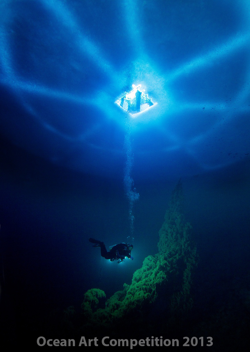 "The photograph was taken near Ekaterinburg, Russia. Lazurny is an old neglected quarry, totally filled with ground waters. Pine trees and bushes on its bottom remain green for many years underwater.  In winter the quarry is covered with thick ice and snow. The circles and rays on ice “sky” are manmade. According to Russian ice diving standards the snow should be removed from the ice in such strange manner to let divers orientate themselves beneath the ice and easily find their way back."