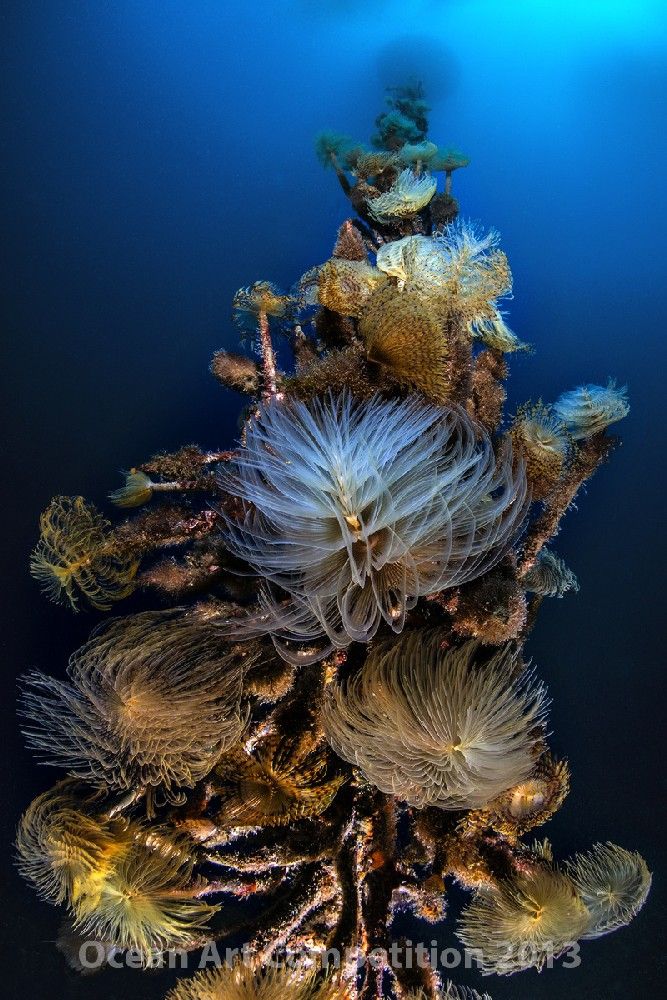 I knew that a big mooring line in the port of Sorrento, Italy had been completely colonized by feather duster worms of every color and size. On a fine summer day I went diving on the site, and I spent more than an hour to take a lot of photos. I was waiting a lot of the time, because when the worms reopened their corollas, I had the impression that the line had been animated!